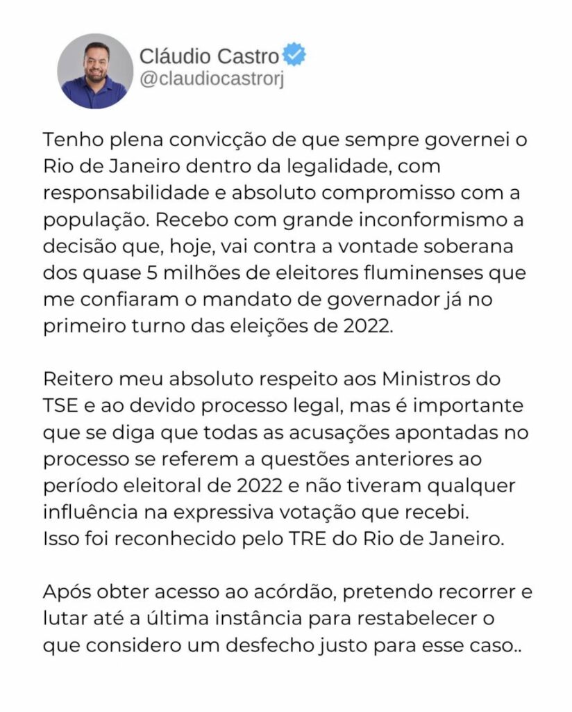 O ex governador do estado do Rio de Janeiro decidiu se pronunciar de forma oficial sobre a sua recente punição judicial. Cláudio Castro utilizou os seus perfis nas plataformas digitais para publicar uma longa nota de esclarecimento aos seus eleitores e apoiadores.